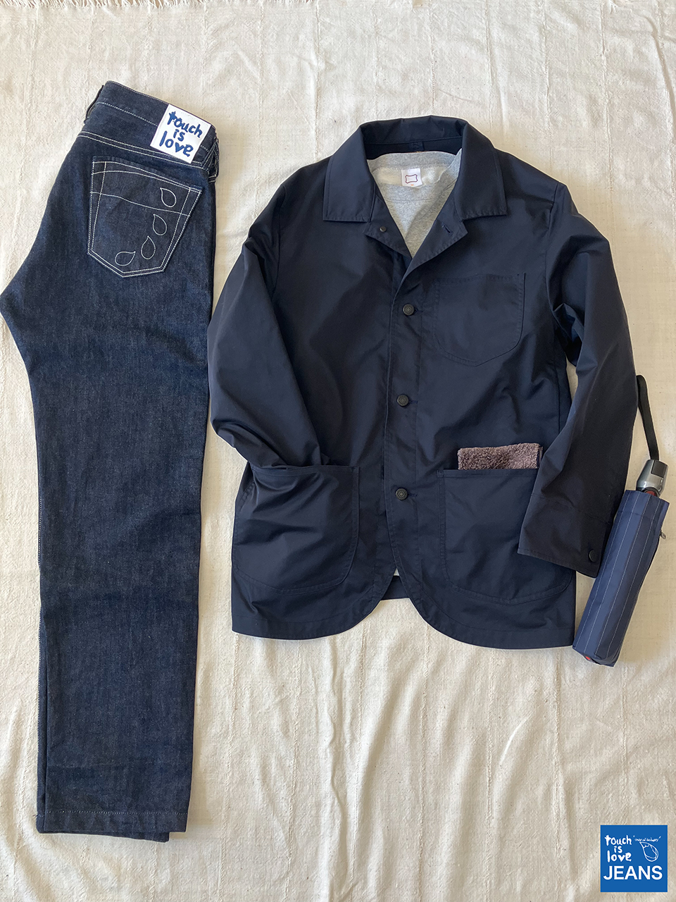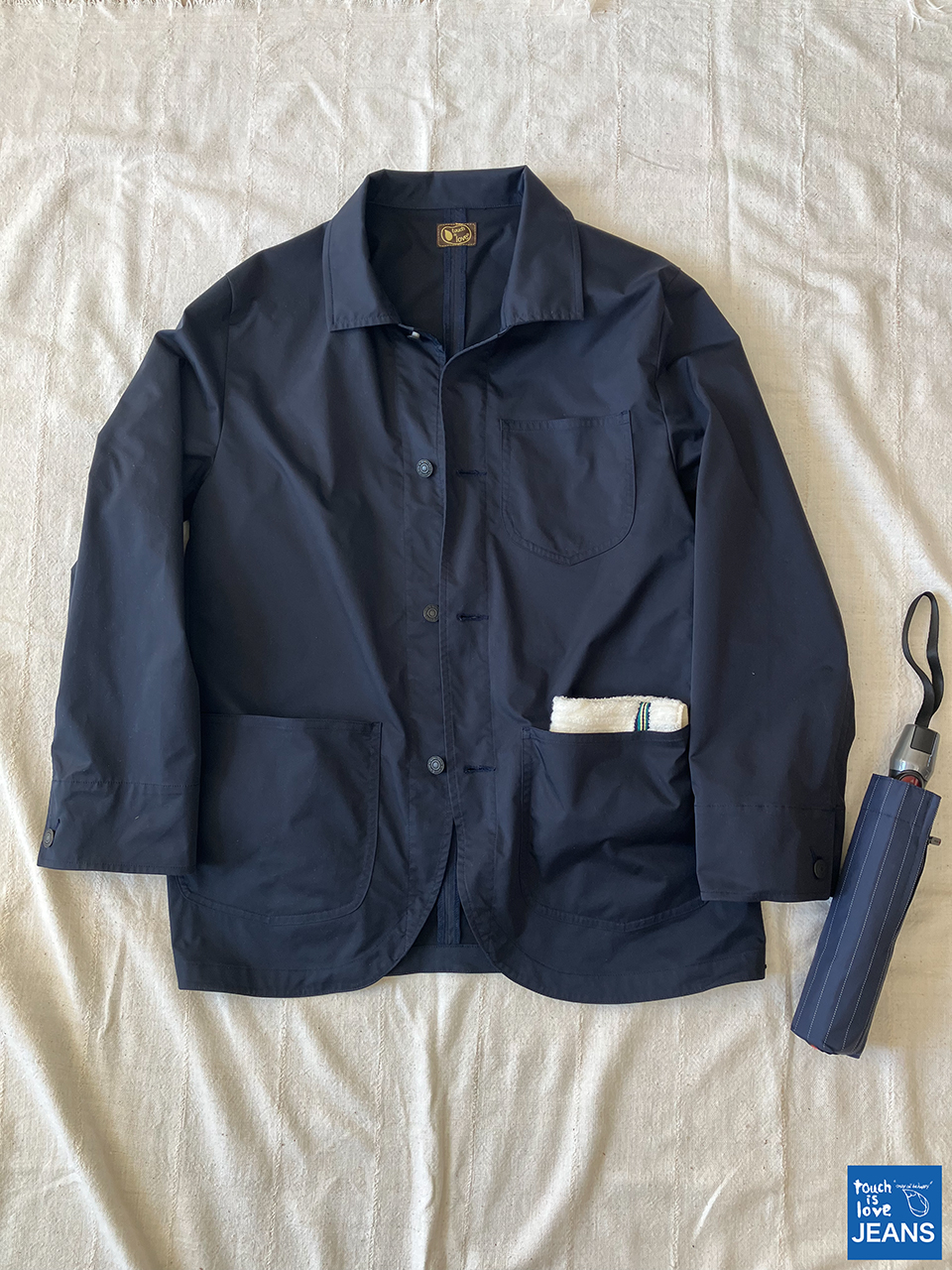 「久々に雨が降り、タッチイズラブジーンズ新作のナイロンジャケット、効力を発揮しております。傘をさしてもどうしても濡れてしまう二の腕部分に雨が染み込まず、本当に快適です。目的地の軒先でさっとタオルハンカチで拭えば、元通り。しかも濡れたハンカチは、大きなポケットへ入れられるので、ビニール袋を出す必要もなし。そしてとにかく、軽い。自分が今まで着た事があるジャケットの中で、最軽量です。レインスーツと異なりフードが付いておらず、レインコートと異なり、長さがない。ナイロンの微かな光沢が、気持ちドレッシーなジャケットに見えなくもなく、更に裏地部分が紺色なのも、ポイントです。仕事でも使えて、もちろんカジュアルにもカバーオールの様にコーディネート出来る。本当に、便利です」
