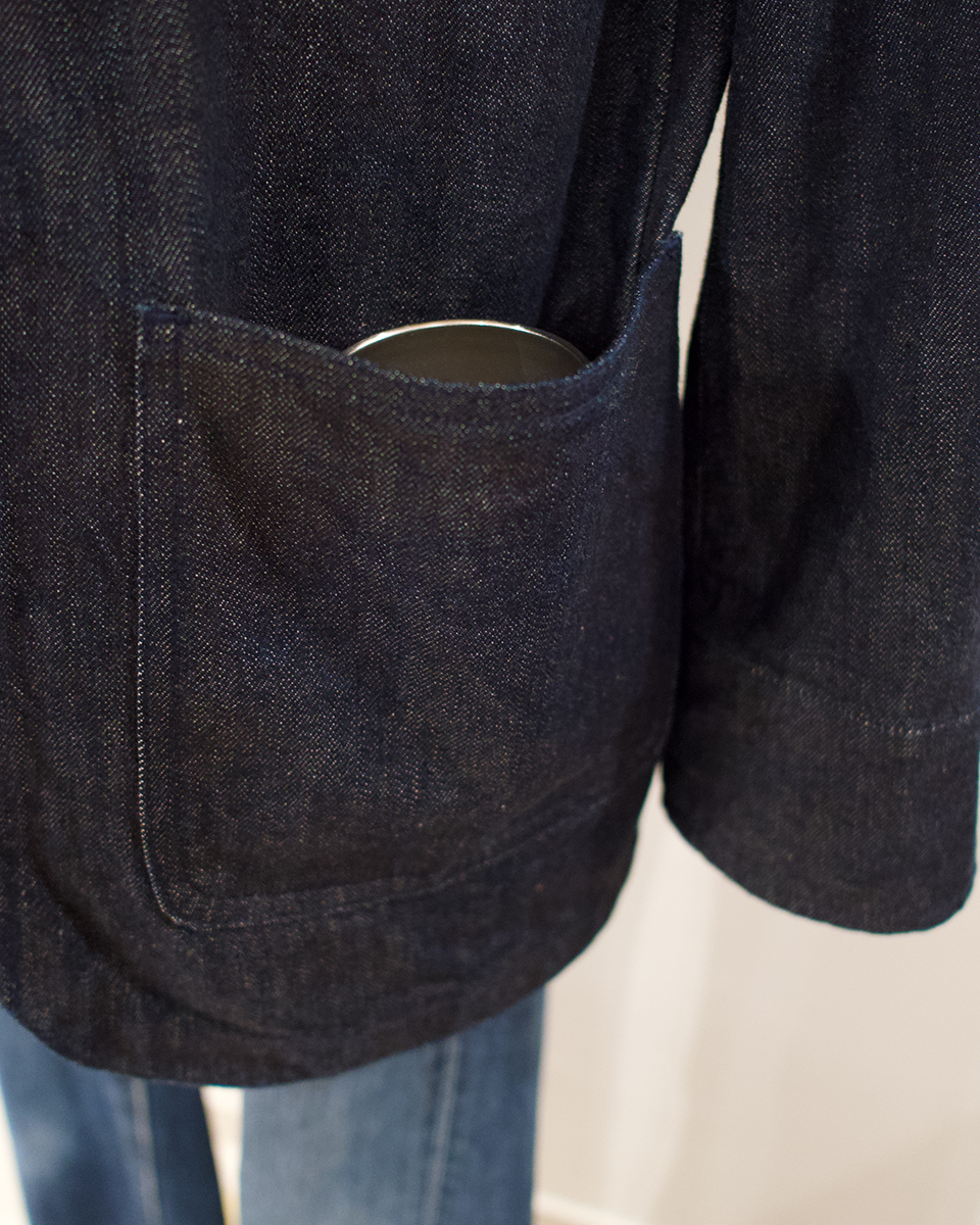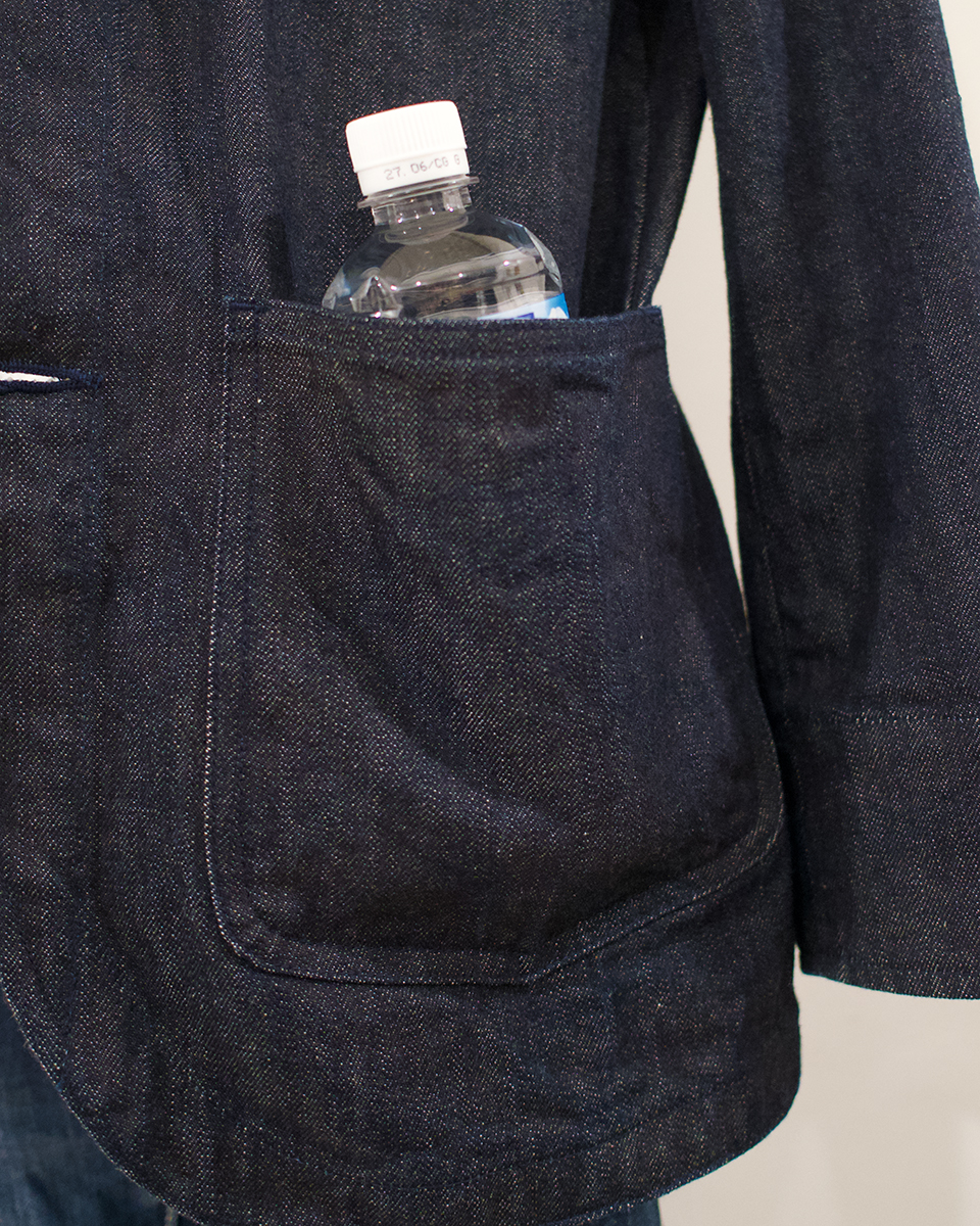 A.もったいない言葉をありがとうございます、恐縮です。「それは生地が、14ozとカバーオール型のジャケットにしては重めのしっかりしたシャトルデニムだから」です。この事が、前見頃に加え、ポケットに入れた物を安定させます。
