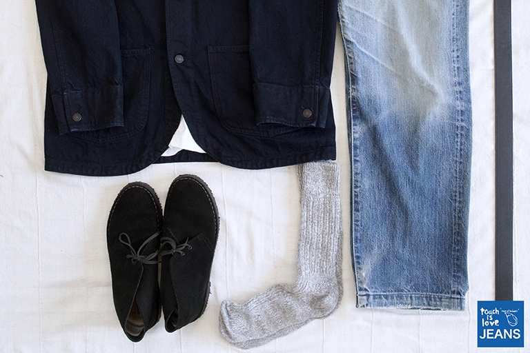 ちなみに「リーバイスは真夏の海に合わないけれど、タッチイズラブジーンズは海辺に合う。どうして?」と有り難いお言葉をお客様から頂戴いたします、その秘密は、ネイビーとホワイトのステッチで出来ているから。とりわけジーンズの裾の所のステッチが、海に似合うかどうかの別れ目。裾が金茶色のステッチで縫われているリーバイスは、カウボーイハットやウエスタンなアメカジとは抜群に相性が良いのですが、海辺のデニムコーデなら、ネイビーのステッチが最適です。素足のサンダルからスニーカーまで、全て似合います。