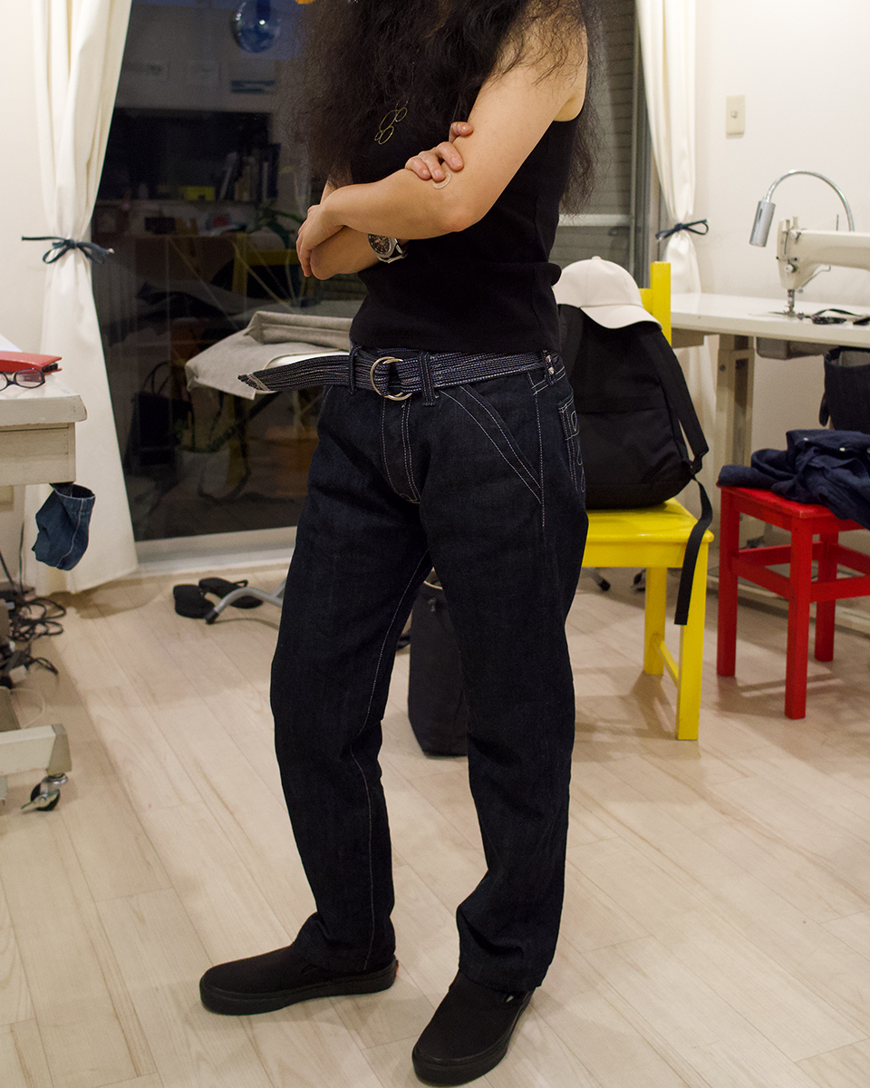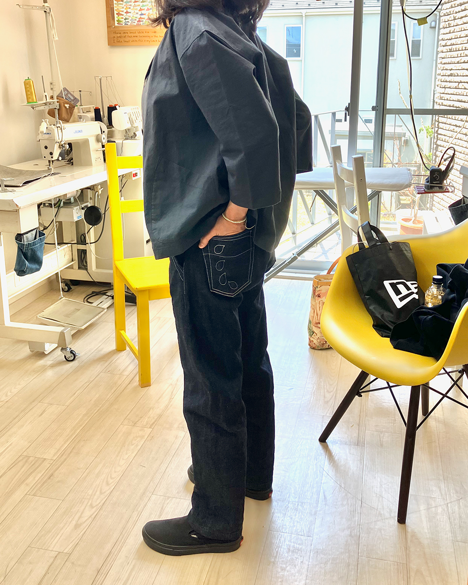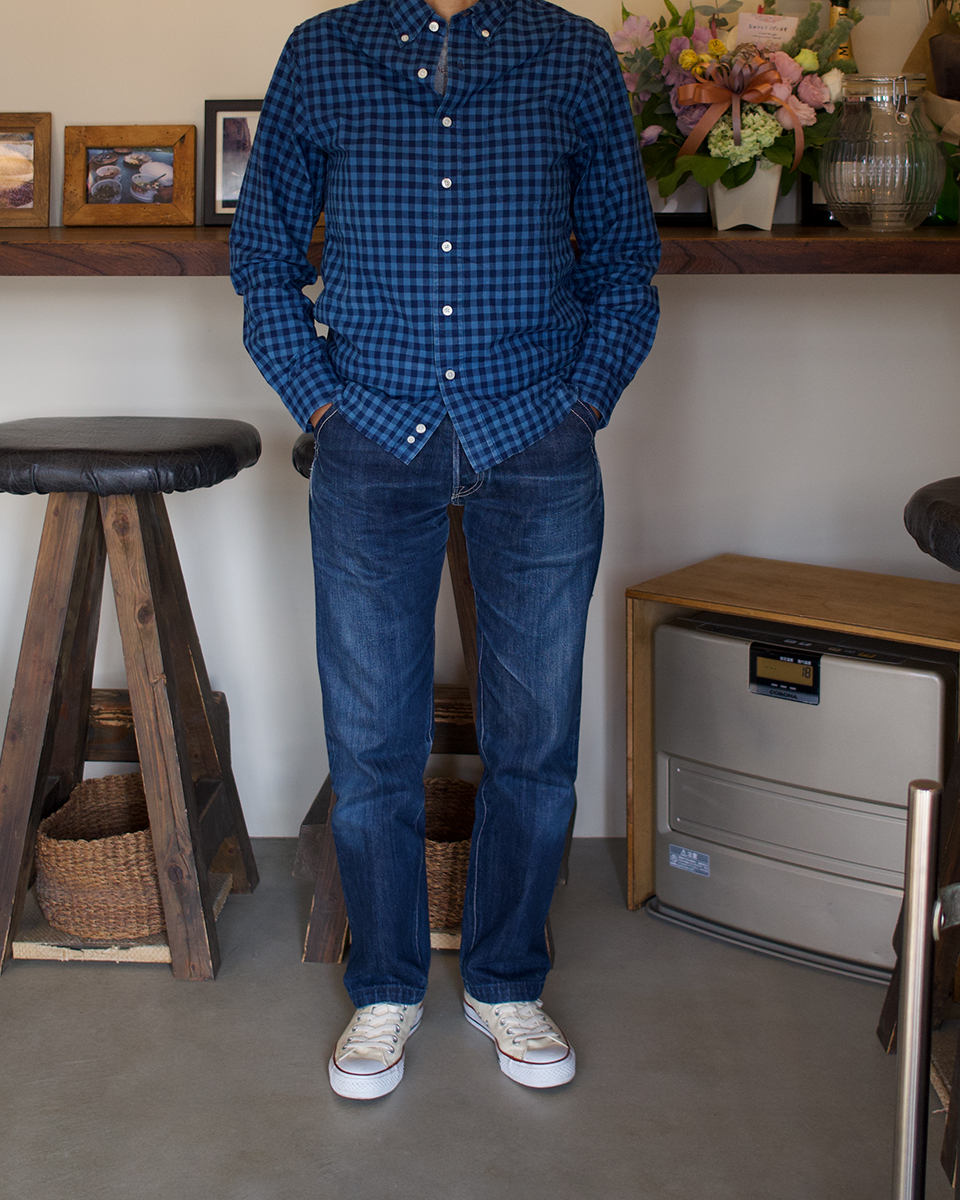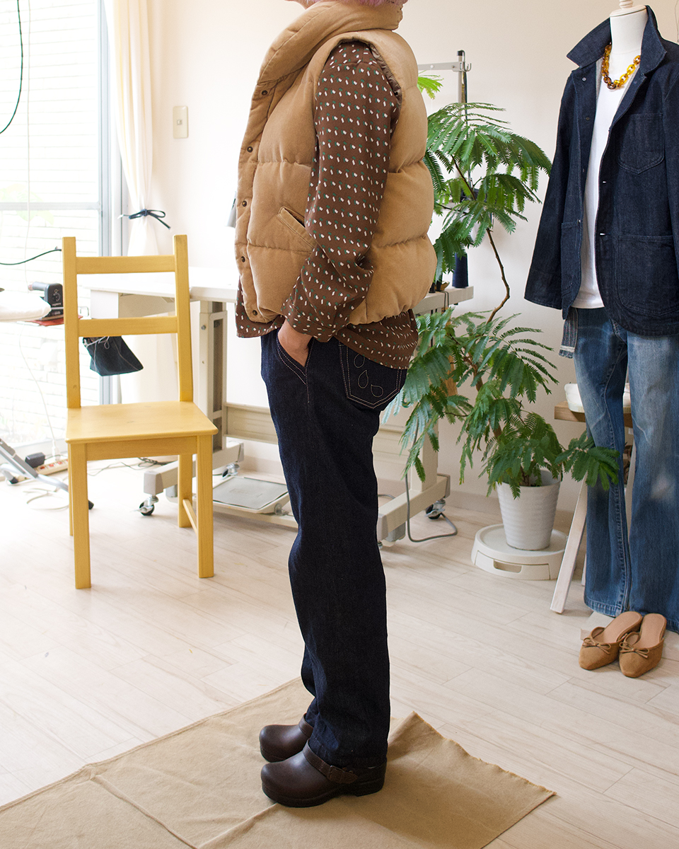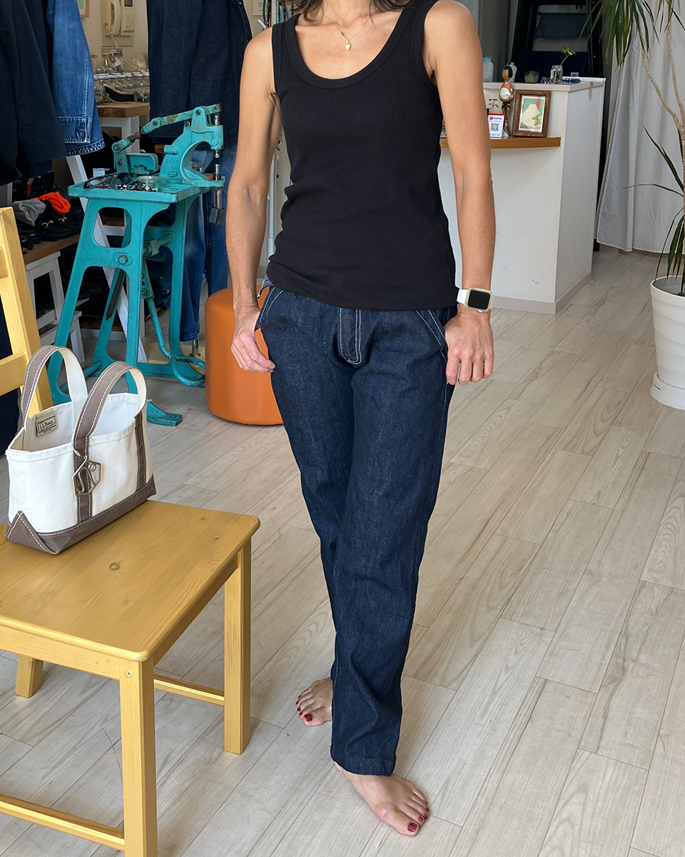 レギュラーフィットのストレートの形ですが、女性の方にも好評をいただいています。