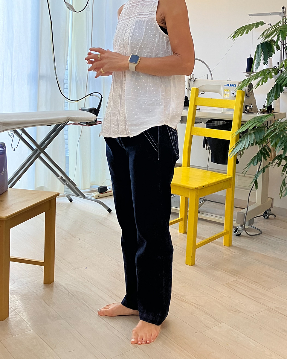 膝位置が高く設定されているのに加えて、膝から裾までがテーパードされているので、前から見ても横から見ても、脛の部bんの膨らみが抑えられて、スマートなシルエットになります。